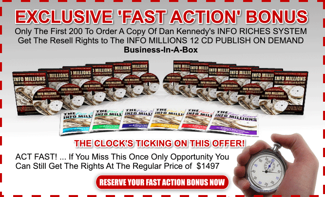 FAST ACTION BONUS:RESELL RIGHTS to INFO MILLIONS 12 CD PUBLISH